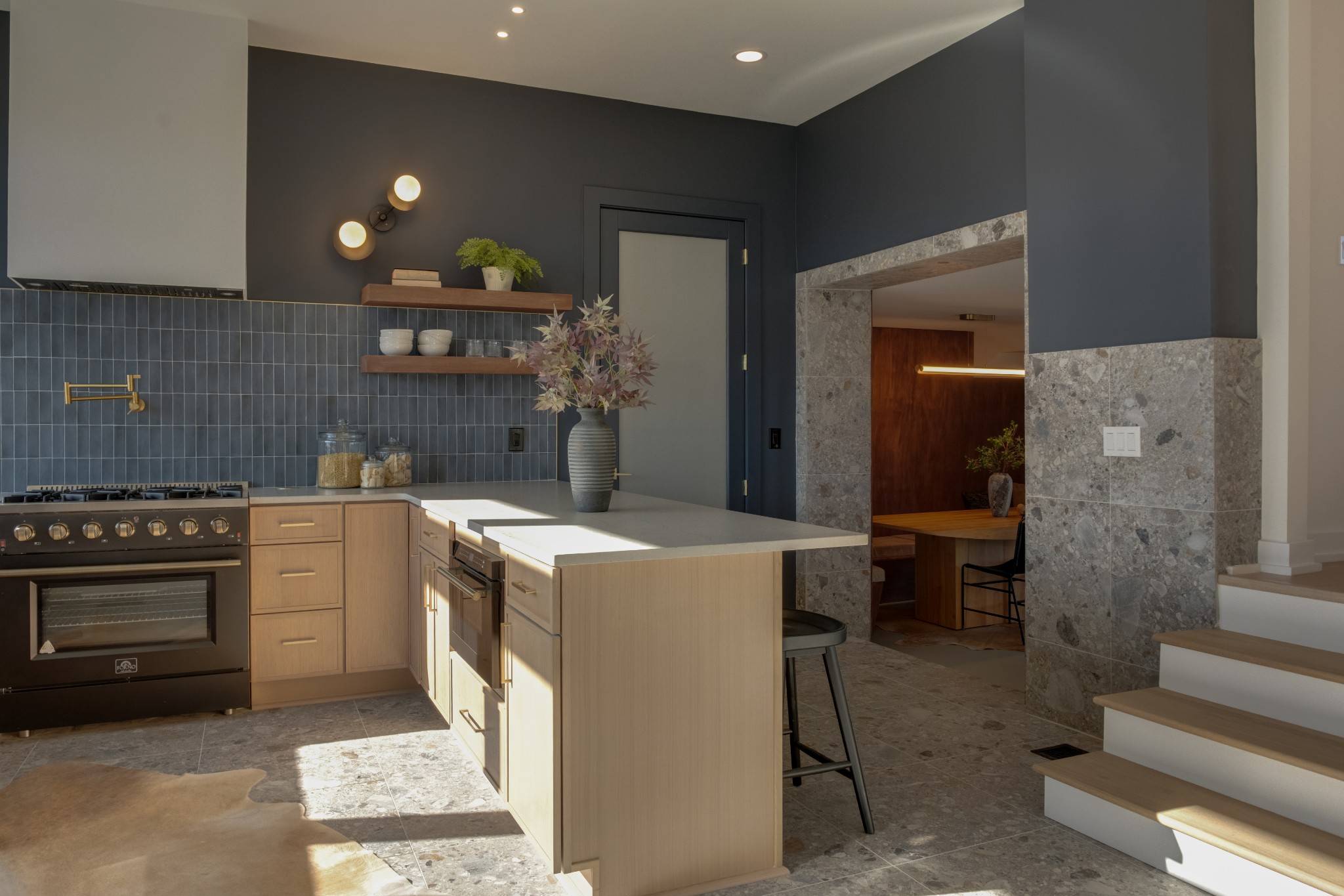 The state-of-the-art kitchen stands as the home's centerpiece—light-soaked, architectural, and meticulously appointed with oversized windows, luxury FORNO appliances, a full gas-burning range, custom cabinetry, refined surfaces, and award-acclaimed Terrazzo. A true chef-caliber environment built to perform.